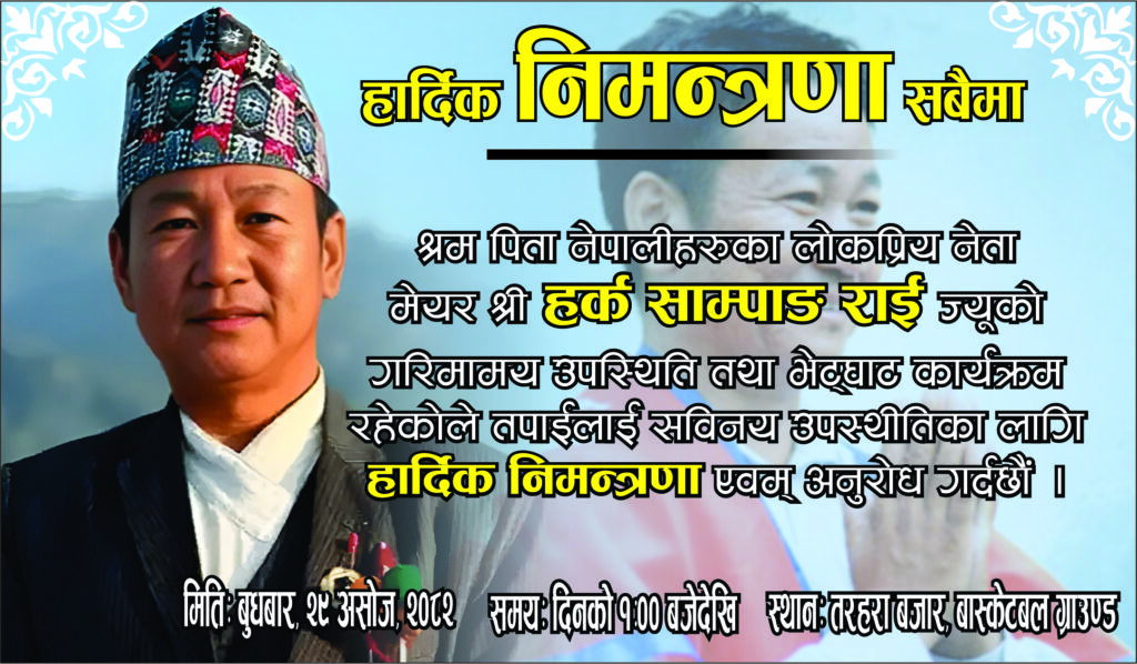 तरहरा । धरान उप-महानगरपालिकाका मेयर हर्क साम्पाङ राई बुधबार तरहरा आउदै हुनुहुन्छ । आगामी निर्वाचनको तयारीमा देशव्यापी रूपमा संगठन विस्तार अभियान गरिरहनुभएका मेयर साम्पाङ तरहरामा आउनुलाई चाखलाग्दो रुपमा हेरिएको छ ।