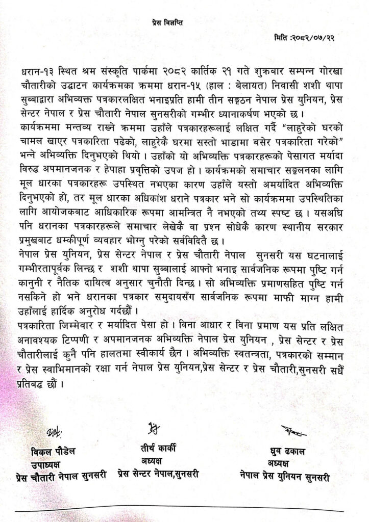 धरान । गोर्खा चौतारी उद्घाटन कार्यक्रममा महिला प्रतिनिधि शशी थापा सुब्बाले पत्रकारिता पेशा र पत्रकारमाथि गरेको टिप्पणीलाई लिएर धरानका प्रमुख तीन राजनैतिक दल सम्बद्ध पत्रकार संगठनहरूले कडा आपत्ति जनाएका छन् । नेकपा (एमाले) निकट प्रेस चौतारीका अध्यक्ष विकल पौडेल, नेकपा (माओवादी केन्द्र) निकट प्रेस सेन्टरका अध्यक्ष तीर्थ कार्की, र नेपाली कांग्रेस निकट नेपाल प्रेस युनियनका अध्यक्ष ध्रुव ढकाल ले संयुक्त रूपमा विज्ञप्ति प्रकाशित गर्दै उक्त अभिव्यक्तिलाई ‘अपमानजनक’ भनेका छन् ।